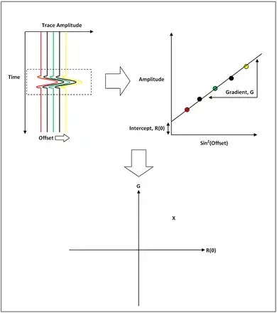 A CMP gather is constructed, the traces are conditioned so that they reference the same two-way travel time, sorted in order of increasing offset and the amplitude of each trace at a specific time horizon is extracted. Remembering the 2-term Shuey Approximation, the amplitude of each trace is plotted against sin^2 of its offset and the relationship becomes linear, as seen in the diagram. Using linear regression, a line of best fit can now be calculated that describes how the reflection amplitude varies with offset using just 2 parameters: the intersect, P, and the gradient, G.
