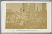 In the night from 8 to 9 September 1874 the sugar refinery Java burnt down. After the fire had started on one of the upper floors at about 1 o'clock at night, it proved unstoppable. The fire department could not do much more than save the office building and other surrounding structures. The buildings were insured for 750,000 guilders, the stock for 600,000, and the annexes for 70,000 guilders. 320 employees lost their job.[47] The bookshop of C.F. Stemler published some photographs of the fire. The sale was one of many initiatives to support the employees who suddenly did not have any income.[48]
