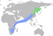 The Amur falcon breeds in east Asia from the Transbaikalia, Amurland, and northern Mongolian region to parts of North Korea. They migrate in a broad front through India and Sri Lanka, sometimes further east over Thailand and Cambodia and then over the Arabian Sea, sometimes in passage on the Maldives and other islands to reach southern Africa. Birds going over India are thought to be aided by strong winds blowing westward. These winds are strong at an altitude of about 3000m and the birds are thought to fly at a height of above 1000m during migration.[9] The route taken to return to their breeding grounds runs slightly more northward. Because of its tendency to wander long distances over the ocean while migrating, this falcon has been found in locations far outside its normal range, such as in Italy, Sweden, Tristan da Cunha, St. Helena and the United Kingdom.[8][2]