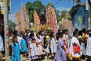 Most Amuzgo are Catholic with a significant percentage being Protestant. The latter phenomenon began in the 1940s with missionaries from an organization called the Instituto Lingüístico de Verano.[1] Catholic churches still dominate centers of municipal seats as well as Catholic festivals and processions, such as those dedicated to patron saints, Carnival, Holy Week and All Saints' Day.[2] Catholic Amuzgos maintain elements of indigenous beliefs which are found in many festivals and other rites. Water figure prominently in folklore and non-Catholic rites as it is essential for survival in the mountains. For example, the beginning of the rainy season is marked by the feast of Saint Mark on 25 April. The date is also known as the "petition for thunder" for rains that will benefit the crops. On this date, chickens are sacrificed over a set of rocks which are said to mythically represent thunder and lightning. The feast of the Archangel Michael on 29 September marks the end of the rainy season as well as the harvest. There is animistic belief in spirits of the mountains, earth, corn, animals and other elements of nature.[1] Health is considered to be more of a spiritual issue than physical, with illness mostly blamed on disharmonious actions. While serious cases are sent to medical facilities in large communities such as Putla and Pinotepa Nacional, most Amuzgos prefer to consult traditional healers. Very minor ailments such as stomach pain, colds, flu etc. are treated with herbal medicine. Those illnesses thought to be primarily spiritual in nature are treated by "tzan tí"(wise men) or "tzan kalwa" (shamans or witches) who can both cure and cause harm.[2]