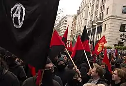 Red-and-black bisected flags at an anti-austerity march in London, 2011