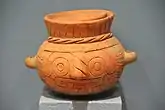 Although very rarely a complete vase, archaeology has resulted in pottery from the Dilmunite city of Qal'at al Bahrain being unearthed. There were two styles of pottery, "Barbar" and "Eastern." Sanctuaries would be filled with small figurines. Most of these figurines were of a bearded horseman holding a mount without reigns. Other figurines depicted hybrids between animals and people.[54] Inside ancient Dilmunite houses storage jars, painted pots, fine chisels, and copper have been found.[55]