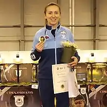 Andrea Arsović (Serbian Cyrillic: Андреа Арсовић, born 5 February 1987) is a Serbian sport shooter. She won a gold medal in the 10m air rifle at the 2015 European Games[2] and is also a two-time European champion in the same discipline as well as a three-time champion in mixed team and once in women's team. Arsović won a gold medal at the 2009 and 2018 Mediterranean Games. She competed in the Women's 10 metre air rifle and women's 50 metre three positions events at the 2012 Summer Olympics.[3][4]