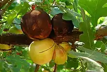 Andricus quercuscalifornicus is an example of an ecosystem engineer because of its ability to induce gall growth.[9] Several evolutionary hypotheses have been proposed to explain the adaptive nature of plant galls. Many of the benefits of induced galls include nutrition, a refuge from natural enemies, and a consistent environment with controlled abiotic factors. Each of these ecological functions can be described as the "nutrition hypothesis", "enemy-avoidance hypothesis", and "microenvironment hypothesis" respectively. According to recent findings, experimental manipulation of abiotic factors (i.e., relative ambient humidity) indicated that A. quercuscalifornicus larvae modify the internal environments of galls, thereby, supporting the microenvironment hypothesis.[10] Galls have hygrothermal inertia to slow down the rates of abiotic conditions, providing a buffer against desiccation; most apparent in immature galls.[11] Furthermore, support for the microenvironment hypothesis does not supersede both the natural enemies and nutrition hypotheses. The large galls produced by A. quercuscalifornicus may aid in the protection against other parasitoids however, this can also led to increase predation from avian species.[12] The moist conditions created in the internal microclimate of galls can also led to increased chance of fungal infection.[13]