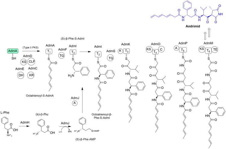 Andrimid is derived from three amino acids which are phenylalanine, valine, and glycine. Phenylalanine is converted to its other conformation, while valine and glycine residues have been elongated by two carbons derived by malonyl units.[5] To incorporate the phenylalanine moiety into the biosynthesize of Andrimid, L-Phe must first be converted to (S)-β-Phe by the aminomutase AdmH. (S)-β-Phe reacts with ATP to active (S)-β-Phe-AMP by the A domain AdmJ which incorporates (S)-β-Phe onto the holo-AdmI(HS-AdmI), forming (S)-β-Phe-S-AdmI. AdmF catalyzes the formation of the octratrienoyl chain and the amine group of alpha-phenylalanine by acylation of its active site cysteine forming the Octratrienoyl-β-Phe-S-AdmI.[5] The hybrid biosynthesis goes through six T domains before final tailoring to form the natural product Andrimid. Additional characteristics of the Andrimid assembly line are the beginning enzymes such as AdmH containing the aminomutase, AdmJ containing the β-Phe adenylation (A) domain which serves as the gatekeepers of the biosynthesis for determining which aromatic amino acid is used by the transglutaminase homologue AdmF. AdmF uses acyl S-T domain and β-aminoacyl-S-T domain to form the amine bond. Furthermore, the three amino acid used in Andrimid are incorporated into the assembly line by AdmH and AdmJ. (S)-β-Phe is generated by AdmH and incorporated by AdmJ. As for the other two amino acids which are valine and glycine, they must first undergo an addition of two carbons by the PKS modules AdmO and AdmM. A total of five proteins are used for andrimid biosynthesis to create the chain initiation step which are AdmA, AdnI, AdnJ, AdmF, and AdmH.[5] During the PKS II pathway, malonyl-CoA is loaded onto the acyl carrier protein (ACP) which is transferred to the active site of ketosynthase (KS), releasing acetyl CoA to generate malonyl-CoA. This reaction undergoes chain elongation using malonyl-coenzyme A (CoA) following ketoreductase (CLF, DH, and KR). Note, the PKS II pathway is a systematic scheme, since there are not sufficient studies that demonstrate a clear route of the enzymes used for this chain elongation step of the fatty acid biosynthesis.[7][8]