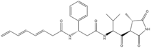 Andrimid is an antibiotic natural product that is produced by the marine bacterium Vibrio coralliilyticus. Andrimid is an inhibitor of fatty acid biosynthesis by blocking the carboxyl transfer reaction of acetyl-CoA carboxylase (ACC).[1][2]