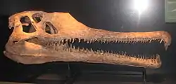 Angistorhinus (meaning "narrow snout" or "hook snout") is an extinct genus of phytosaur known from the Late Triassic period of Texas and Wyoming, United States. It was first named by Mehl in 1913 and the type species is Angistorhinus grandis.[1] Other species from Texas and Wyoming, A. alticephalus (Stovall and Wharton, 1936), A. gracilis (Mehl, 1915) and A. maximus (Mehl, 1928), are cospecific with the type species.[2] Angistorhinus is known from the holotype UC 631, partial skull and lower jaws recovered from the Popo Agie Formation, Chugwater Group, Wyoming and from the associated paratype UM 531, a partial skull, TMM 31098-1, skull and lower jaws and ROM 7977, partial skull and lower jaws, recovered from the 'Pre-Tecovas Horizon' in the Dockum Group, Texas. A possible second species, A. talainti is known from the Triassic of Morocco.[3] In 1995, Long and Murry created the new combination, Angistorhinus megalodon by synonymy for Brachysuchus.[4] Hungerbühler and Sues (2001) hypothesised that Angistorhinus is a junior synonym of Rutiodon.[5] However, in 2010 Michelle R. Stocker retained the validity of Brachysuchus and of A. grandis.[6]