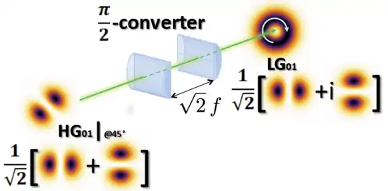 OAM can also be generated by converting a Hermite-Gaussian beam into a Laguerre-Gaussian one by using an astigmatic system with two well-aligned cylindrical lenses placed at a specific distance (see figure) in order to introduce a well-defined relative phase between horizontal and vertical Hermite-Gaussian beams.[15]