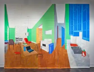 Agee's later exhibitions and installations offer diverse displays of ceramic figurines, domestic objects and pieces of furniture, set against hand-painted and stenciled, large-scale "wallpaper drawings" on Thai mulberry paper.[50][1][51][2] Rather than imitate expensive materials as traditional wallpaper designs do, Agee's wallpapers celebrate everyday spaces and accessible, richly patterned commercial products as objects of interest, much like the early work of Warhol or the interiors of Matisse and Roy Lichtenstein do;[6][23][50] they often comment pointedly on work, domestic life, gender and class, material culture, and museum display.[5][8][20]