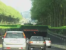 The Annie Cordy Tunnel (formerly the Leopold II Tunnel) is a traffic tunnel in Brussels. The tunnel, under the Boulevard Léopold II, connects the Rogier Tunnel and the Small Ring with the Basilica Tunnel and the A10/E40 via Keizer Karellaan. The tunnel is an important arterial road for traffic leaving or entering Brussels. It is the western approach road for Brussels. With a length of 2,534 meters it is also the longest road tunnel in Belgium.