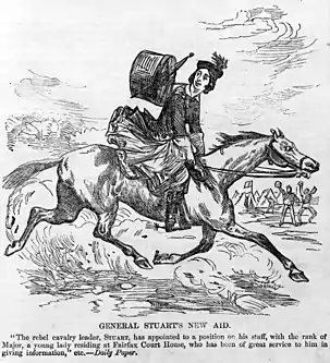 As Union forces occupied the Fairfax region in mid-1861, Ford circulated among the officers and garnered valuable intelligence about troop strengths and planned movements, which she passed along to Brigadier General J.E.B. Stuart, in whose artillery her brother, Charles, served.[2] Ford also spied for John S. Mosby, a noted partisan ranger. Stuart, grateful for her service and appreciative of the information he had received, designated Ford as an honorary aide-de-camp on October 7, 1861.