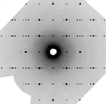 The diffraction patterns of aperiodic crystals contain two sets of peaks, which include "main reflections" and "satellite reflections".[1] Main reflections are usually stronger in intensity and span a lattice defined by three-dimensional reciprocal lattice vectors. Satellite reflections are weaker in intensity and are known as "lattice ghosts". These reflections do not correspond to any lattice points in physical space and cannot be indexed with the original three vectors. To understand aperiodic crystal structures, one must use the superspace approach.[3] In materials science, "superspace" or higher-dimensional space refers to the concept of describing the structures and properties of materials in terms of dimensions beyond the three dimensions of physical space. This may involve using mathematical models to describe the behavior of atoms or molecules in a materials in four, five, or even higher dimensions.[4]