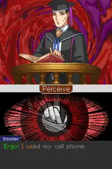The trial portions consist of listening to and cross-examining witness testimonies. The player is given the option to either Press or Present evidence in response to statements made by witnesses.[7] The player can either select their choice or yell into the microphone.[8] By choosing Press, the player questions the witness's statement, which sometimes causes the witness to change their testimony. When finding inconsistencies in the testimony, the player may choose Present in order to show a piece of evidence that they think contradicts the testimony.[9] The player has a health bar, representing the judge's patience. If the player presents incorrect pieces of evidence or choose incorrect answers to questions in court, health is lost. If the health bar reaches zero, the player loses the game and their client is declared guilty.[10] A new system, known as the "Perceive System," can be used to look for motions or actions made by witnesses that show nervousness, similar to a tell in poker.[11] The game also includes a "Crime Recreation Mode" that models evidence or the crime scene in a 3-D rendition and allow the player to explore the recreation to look for clues. Additionally, the game often recreates the crime in cutscene sequences, allowing the player to observe the action and find contradictions.[12]