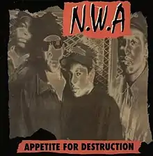 "Appetite for Destruction" is a song by American hip hop group N.W.A. The song is the second single from their final studio album Niggaz4Life. The song also appeared on The Best of N.W.A: The Strength of Street Knowledge. The music video featured members of N.W.A robbing a bank in a 1920s setting. After they rob the bank, the video returns to color and a modern setting. In the last scene, when the other members of N.W.A attempt to get away in a car, Eazy-E blows the car up killing the other members thus ending the song with the line, "Number 10 is my appetite to kill".