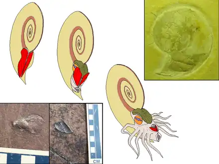 Aptychi seem to have most often existed as bilaterally-symmetrical pairs, and were first described (incorrectly) as being the valves of bivalve mollusks. Aptychi are now considered to be a two-valved closing hatch on the shells of extinct ammonites or a double-plate jaw-piece similar to that of some modern cephalopods.[2][3][4][5]