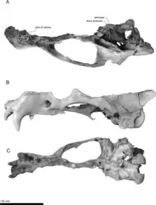 Partial holotype cranium shown from above, the left side, and below
