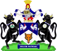 On either side a bull Sable armed and unguled Or gorged with a collar Vair the dexter charged on the shoulder with a plate thereon a thistle slipped and leaved Proper the sinister charged on the shoulder with a rose Argent barbed and seeded also Proper.
