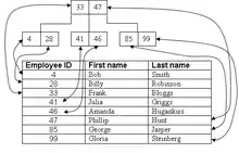 Btrieve uses indexes on certain columns to retrieve data in a speedy fashion. The structure at the top is a b-tree data structure and indexes the Employee ID column of the database table. The arrows point from the index value to the rows that contains the value in the "Employee ID" column.
