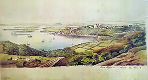 On December 7, 1744, Jerônimo de Ornellas received by royal charter possession of the land he had occupied since 1732 for animal husbandry, around the anchorage on the Guaíba known at the time as the Port of Viamão. Viamão was located a few kilometers to the east. Consolidating a series of previously sparse initiatives of occupation of the state, from 1752 onwards, families of Azorean immigrants sent by the Portuguese government began to arrive, giving rise to the historical center of the future Porto Alegre, and also to some conflicts with the first sesmeiro, Ornellas. The area was then expropriated and made legally available to the settlers already there, but the actual sharing and delivery of the individual lots would only happen in 1772. In 1760, a large surrounding region, ranging from the Central Depression, the northeast, and the entire coast, already de facto occupied by the Portuguese, was organized into the captaincy of Rio Grande de São Pedro. Indigenous peoples living in the area were gradually removed or exterminated.[1][2] In 1772, the settlement was elevated to the status of a Freguesia, placed under the protection of Francis of Assisi, and officially named Freguesia de São Francisco do Porto dos Casais, in allusion to the Azorean couples who founded it, disconnecting it from the town of Viamão, then head of the Captaincy. Governor José Marcelino de Figueiredo then ordered the captain of engineering and cartographer Alexandre José Montanha to draw a plan.[1] He organized the layout around the Alto da Praia, a hill by the lakeside from which there is an unobstructed view of the entire surroundings, an embryo of the Praça da Matriz (Matriz Square), the vital core of the settlement that would concentrate its main public buildings and then attract the elite.[4][5]