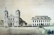 With this, came new infrastructure needs. Among them was the construction of the so-called "Clay Palace" ("Palácio de Barro"), the first important building of the small town, erected in 1773 at the behest of the governor, aiming to receive the general administration of the captaincy. The building was completed in 1789 and was used until 1896 when it was demolished. It was a two-story palace with two main floors and an attic, symmetrically organized - a central door with four windows on each side. Above, a row of windows, and a pitched roof. The openings had a curved arch, typical of colonial Baroque, and the upper ones received an ornamental cornice, also in a curve.[3][6]
