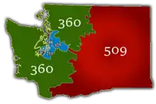 Area code 509 is the telephone area code in the North American Numbering Plan (NANP) for the eastern part of the U.S. state of Washington. The numbering plan area (NPA) roughly comprises the state east of the Cascade Mountains, and includes Spokane, the Tri-Cities (Richland, Pasco, and Kennewick), Ellensburg, Yakima, Walla Walla, and Wenatchee. The area code was assigned in a split of area code 206 in 1956.[1]