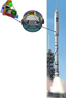 • A forward skirt extension, which housed new, larger parachutes. The three main parachutes each had a 150-foot (46 m) diameter, compared to the Shuttle booster main parachutes, which are 136 feet (41 m) across. It also had a Shuttle booster heritage nosecap that covers the pilot and drogue parachutes. Jettisoning the nosecap released the pilot parachute which pulled out the drogue. The forward skirt extension separated from the booster deploying the main parachutes.