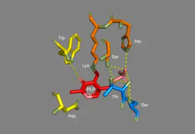 - ↑ Toney MD (January 2005). "Reaction specificity in pyridoxal phosphate enzymes". Archives of Biochemistry and Biophysics. 433 (1): 279–87. doi:10.1016/j.abb.2004.09.037. PMID 15581583.