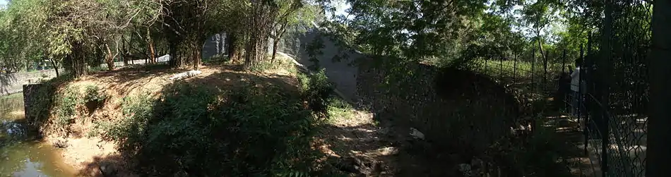 The zoo is located within the Vandalur Reserve Forest area.[24] The zoo's ecosystem consists of dry deciduous and dry evergreen scrub forest vegetation of the Eastern Ghats, a degraded forest consisting of mostly thorny bushes, receiving an average annual rainfall of 1,400 millimetres (55 in) and an average annual temperature of 26 °C (79 °F).[25] The terrain is a gentle undulating one[21] ranging in altitude from 10 to 100 metres (33 to 328 ft) with an average elevation of 50 metres (160 ft) above sea level.[25] The park was designed to keep the natural vegetation of the area intact except where enclosures, roads, and structures had to be constructed. Originally a sparse scrub forest invaded by weeds, consisting of species such as Carissa sp., Gmelina sp., Eugenia sp., Acacia sp., Instia sp. and a few other dry evergreen forest species, the park's vegetation was gradually enriched by planting dry evergreen species.[25] The entire campus has been fortified by means of a compound wall,[26] preventing any biotic interference in the park and allowing the natural growth of vegetation, which give the park the look of a natural forest. The park is built based on the 'open zoo' concept. The exhibits were originally based on taxonomic and geographical distribution of the species, but have now been replaced by ecological niches and habitats. The order of priority is local species, followed by regional, national, and international species. The use of moats has made it possible to house predator and prey in extended enclosures that provide a panorama of wildlife. There are over 75 moated enclosures in the park. Enrichments in the form of ladders, climbing materials, etc. are provided for the animals to move around the enclosure freely.[27]