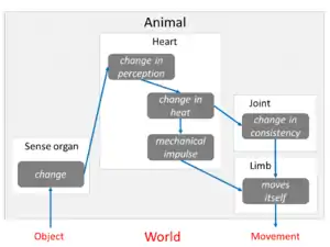 The system worked as follows. The animal's sense organ is altered when it detects an object. This causes a perceptual change in the animal's seat of sensation, which Aristotle believed was the heart (cardiocentrism) rather than the brain. This in turn causes a change in the heart's heat, which causes a quantitative change sufficient to make the heart transmit a mechanical impulse to a limb, which moves, moving the animal's body. The alteration in the heat of the heart also causes a change in the consistency of the joints, which helps the limb to move.[17]