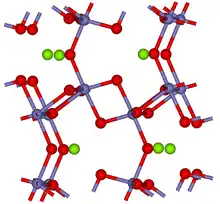 Chemical composition of most armalcolite samples can be decomposed into a sum of metal oxides as follows: TiO2 (concentration 71–76%), FeO (10–17%), MgO (5.5–9.4%), Al2O3 (1.48–2%), Cr2O3 (0.3-2%) and MnO (0–0.83%). Whereas the titanium content is relatively constant, the ratio of magnesium to iron varies and is usually lower than 1.[2][10] A so-called Cr-Zr-Ca variety of armacolite is distinguished which has an elevated content of Cr2O3 (4.3–11.5%), ZrO2 (3.8–6.2%) and CaO (3–3.5%). These varieties are not distinct and intermediate compositions are also found.[13] The iron-poor (magnesium-rich) modification of armacolite has the same crystal structure and occurs in the Earth's crust as the mineral unofficially named "karrooite".[15][18]