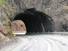 The Arnardalshamar Tunnel is a tunnel in Iceland, located in Westfjords along Route 61. It has a length of 30 m (98 ft) and was opened in 1948.[1] It was the first manmade tunnel in Iceland and it is also the shortest.[2][3][4] It cuts through a basalt dike known as Arnardalshamar, between Skutulsfjörður and Álftafjörður.[5] The tunnel was widened to 8.5 m (28 ft) in 1995.[6]