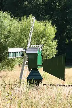 The mill is what the Dutch describe as a Weidemolen (English: Meadow mill). It is a small hollow post mill on a roundhouse. The mill is winded by tail vane. The buck and roundhouse are covered in boards. The sails are Common sails. They have a span of 3.85 metres (12 ft 8 in). The sails are carried on a wooden windshaft. The windshaft carries the brake wheel which has 21 cogs. This drives the wallower (9 cogs) at the top of the upright shaft.[1] At the bottom of the upright shaft a centrifugal pump is driven.[2]