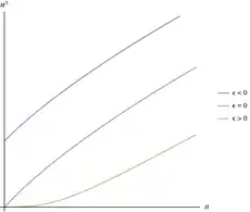Arrott plot for a simple mean field ferromagnetic phase transition. Here, as in the Arrott's paper,[1] the relationship is demonstrated as versus , but Arrott plots are usually rearranged to versus . The value of denotes whether the temperature is above, below, or at the Curie temperature (see text).