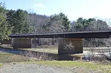 The second Arroyo Bridge (1901-2004), a three-span, metal Pratt Truss bridge, 287 feet (87 m) long, built by the Nelson and Buchanan company of Pittsburgh and Chambersburg, Pennsylvania, crossed the Clarion River here. This bridge was built to replace the Arroyo Bridge Company's toll bridge. Squire Webster, the toll master, lived at one end of the bridge and collected the tolls from travelers. A family with a horse and wagon could cross for 10 cents. The bridge was such an important structure in the town that dances and parties were held on its deck during Arroyo's heyday. In the early 2000s, the Arroyo Bridge was replaced again.