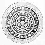 | Shield of Sarduri II. Cuneiform inscription on the edge reads: "Sarduri, son of Argishti dedicates this helmet to God Ḫaldi."[12] | Shield of Argishti I. Cuneiform inscription on the edge reads: "Argishti, son of Menua, dedicates this helmet to God Ḫaldi."[13] | ||