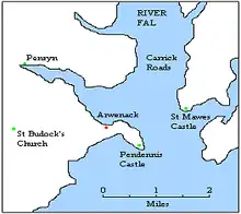 Arwenack is a historic manor on the site of what is today the town of Falmouth, Cornwall, England, United Kingdom. Historically in the parish of St Budock, it was partly destroyed in 1646, and only a remnant survives today. It was long held by the Killigrew family, which was responsible for the development of the town of Falmouth, Sir Peter Killigrew (died 1667), MP, having received a royal charter for its foundation in 1661.[1]
