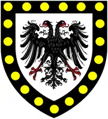 John Killigrew, senior, of Arwenack, eldest son and heir, who married Mary Boleigh, daughter and heiress of John Boleigh.[3] The Killigrews later quartered the arms of Boleigh: Argent, on a chevron sable between three torteaux as many bezants,[7] as visible on the monumental brass in St Budock's Church to John Killigrew (died 1567) of Arwenack, first Governor of Pendennis Castle.