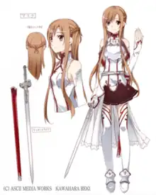 Asuna Yuuki (結城 明日奈, Yūki Asuna) is a fictional character who appears in the Sword Art Online series of light novels by Reki Kawahara. She is mononymously more commonly known as just Asuna (アスナ), her player name in the eponymous video game which the novels are set in. Asuna appears as the lover of Kirito; as well as the female lead, she is in the novels a sub-leader of the Knights of the Blood Oath (血盟騎士団, Ketsumei Kishidan) guild, notable for being the strongest guild in Aincrad. She is depicted as having earned a reputation as a skilled player in-game, giving her the nickname Flash (閃光, Senkō), which, coupled with her physical attractiveness, have made her well-known and sought after by other players.