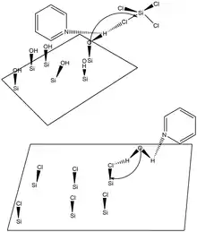 The use of catalysts is of paramount importance in delivering reliable methods of SiO2 ALD. Without catalysts, surface reactions leading to the formation of SiO2 are generally very slow and only occur at exceptionally high temperatures. Typical catalysts for SiO2 ALD include Lewis bases such as NH3 or pyridine and SiO2; ALD can also be initiated when these Lewis bases are coupled with other silicon precursors such as tetraethoxysilane (TEOS).[24] Hydrogen bonding is believed to occur between the Lewis base and the SiOH* surface species or between the H2O based reactant and the Lewis base. Oxygen becomes a stronger nucleophile when the Lewis base hydrogen bonds with the SiOH* surface species because the SiO-H bond is effectively weakened. As such, the electropositive Si atom in the SiCl4 reactant is more susceptible to nucleophilic attack. Similarly, hydrogen bonding between a Lewis base and an H2O reactant make the electronegative O in H2O a strong nucleophile that is able to attack the Si in an existing SiCl* surface species.[40] The use of a Lewis base catalyst is more or less a requirement for SiO2 ALD, as without a Lewis base catalyst, reaction temperatures must exceed 325 °C and pressures must exceed 103 torr. Generally, the most favorable temperature to perform SiO2 ALD is at 32 °C and a common deposition rate is 1.35 angstroms per binary reaction sequence. Two surface reactions for SiO2 ALD, an overall reaction, and a schematic illustrating Lewis base catalysis in SiO2 ALD are provided below.