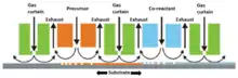 In temporal ALD the separate precursor and co-reactant doses are separated from each other in time by a purge step. In contrast, in spatial ALD (s-ALD), these gases are delivered at different locations, so they are separated in space. In atmospheric pressure s-ALD the precursor and co-reactant are delivered continuously and they are separated from each other by a gas curtain to prevent gas phase reactions. Such gas curtain typically consists of nitrogen injection and exhaust positions, see Figure 1. As a substrates moves through the different gas zones, self-limiting reactions take place at the substrate surface and the ALD process takes place. As this process can easily be accelerated, the deposition rate for spatial ALD can be much higher than for conventional ALD. For example, for ALD of Al2O3 the deposition rate increases from 100-300 nm per hour to 60 nm per minute.[5]