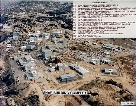 Atomics International was the prime contractor to the AEC for the development of the SNAP reactors. In the late 1950s to the early 1960s, Atomics International established a number of government-owned facilities to support the SNAP program at the Energy Technology Engineering Center (ETEC) in Area IV of the Santa Susana Field Laboratory (SSFL).[24] The SNAP-10A was the only nuclear reactor launched and flight tested by the United States.[25] The City of Los Angeles issued a proclamation to recognize the accomplishment. The facilities included underground test facilities to test the compact SNAP nuclear reactors, non-nuclear test and support buildings, and administrative offices.[26] Atomics International developed and tested five different SNAP reactors under the Systems for Nuclear Auxiliary Power Program.[27]