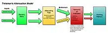 Attenuation theory, also known as Treisman’s Attenuation Model, is a model of selective attention proposed by Anne Treisman, and can be seen as a revision of Donald Broadbent's filter model. Treisman proposed attenuation theory as a means to explain how unattended stimuli sometimes came to be processed in a more rigorous manner than what Broadbent's filter model could account for.[1] As a result, attenuation theory added layers of sophistication to Broadbent's original idea of how selective attention might operate: claiming that instead of a filter which barred unattended inputs from ever entering awareness, it was a process of attenuation.[2] Thus, the attenuation of unattended stimuli would make it difficult, but not impossible to extract meaningful content from irrelevant inputs, so long as stimuli still possessed sufficient "strength" after attenuation to make it through a hierarchical analysis process.[2]