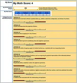 A key advantage of the AHM is that it supports individualized diagnostic score reporting using the attribute probability results. The score reports produced by the AHM have not only a total score but also detailed information about what cognitive attributes were measured by the test and the degree to which the examinees have mastered these cognitive attributes. This diagnostic information is directly linked to the attribute descriptions, individualized for each student, and easily presented. Hence, these reports provide specific diagnostic feedback which may direct instructional decisions. To demonstrate how the AHM can be used to report test scores and provide diagnostic feedback, a sample report is presented next.[9] In the example to the right, the examinee mastered attributes A1 and A4 to A6. Three performance levels were selected for reporting attribute mastery: non-mastery (attribute probability value between 0.00 and 0.35), partial mastery (attribute probability value between 0.36 and 0.70), and mastery (attribute probability value between 0.71 and 1.00). The results in the score report reveal that the examinee has clearly mastered four attributes, A1 (basic arithmetic operations), A4 (skills required for substituting values into algebraic expressions), A5 (the skills of mapping a graph of a familiar function with its corresponding function), and A6 (abstract properties of functions). The examinee has not mastered the skills associated with the remaining five attributes.