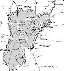 Starting in the 1850s during the California Gold Rush, the city of Sacramento rapidly grew around the confluence of the Sacramento River and its tributary the American River, near the middle of the Central Valley of California. The city's increasing population necessitated the construction of an extensive system of levees on the two rivers to prevent flooding. These early flood control works were insufficient; in 1862, the city was inundated so completely that the state government was temporarily moved to San Francisco.[3] In 1955, the U.S. Army Corps of Engineers built the Folsom Dam at the confluence of the North and South Forks of the American River to provide flood control for the Sacramento metropolitan area.[4][5][6] However, the Folsom Dam, with a capacity of just 1 million acre feet (1.2 km3) compared to the annual American River flow of 2.7 million acre feet (3.3 km3), proved inadequate.[7] A flood in 1955 filled the Folsom Reservoir to capacity, before the dam was even completed; it has also filled many times since.[8] However, increased water uses and diversions, requirements for 200-year flood control, and joint system operations have increased seasonal flood capacity in Folsom Lake.[9]