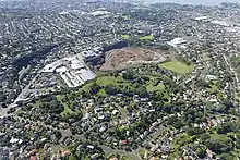 | Whakamuhu / Saint Heliers / Glover Park – see Achilles Point | 161.0 ± 36.0 | 65 metres (213 ft) | 36°50′49″S 174°52′04″E / 36.846911°S 174.867662°E | ![]() Whakamuhu / St Heliers Volcano, 2009 ![]() The Glover Park sports ground at lower right of this photo is situated within the Whakamuhu tuff ring. Over the water in the distance on the right is the scoria cone of Maungauika / North Head and in the left middle is the tuff crater filled in by the sea of Ōrākei Basin. Beyond Ōrākei Basin in the middle distance are several vegetation covered scoria cones. | |