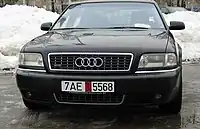 The Audi A8 is a full-size luxury sedan manufactured and marketed by the German automaker Audi since 1994. Succeeding the Audi V8, and now in its fourth generation, the A8 has been offered with both front- or permanent all-wheel drive—and in short- and long-wheelbase variants. The first two generations employed the Volkswagen Group D platform, with the current generation deriving from the MLB platform. After the original model's 1994 release, Audi released the second generation in late 2002, the third in late 2009, and the fourth and current iteration in 2017. Noted as the first mass-market car with an aluminium chassis, all A8 models have used this construction method co-developed with Alcoa and marketed as the Audi Space Frame.[2]