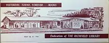 This library was built on a portion of land previously purchased by the Village of Richfield from Augsburg College in 1949 for $60,000.[4] Costs totaled $889,810 including construction, architect's fees, the land, landscaping and equipment.[5] In creating the 15,000 square foot building, existing oak trees, remnants of the oak savanna, were retained, as the architects designed a building with staggered windows on the east and west sides.