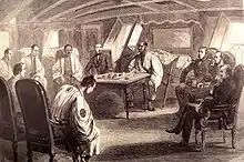 Franco-Anglo-Japanese conference on the Semiramis, 2 July 1863. Forefront: French interpreter Frederik Blekman, Japanese interpreter. Background (from left to right): Three Japanese governors of Yokohama, Duchesne de Bellecourt, daimyō Sakai-Hida-no-Kami, Colonel Neale (British representative in Japan), Admiral Jaurès, Admiral Kuper