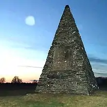A square, stone pyramid southwest of the fortress bears a plaque with the inscription: «Her bær den Sted nu Korn som fordum haffuer baaren den dyre Rigens Mand af Herren sielff udkaaren Jens Bielcke, som i Fem og Fyrretiuffe aar Rett Landsens Fader och To Kongers Kandtzler waar». The plaque also bears the coats of arms of Ove Bjelke and of his three wives, as well as a Latin text that says that Bjelke, "a much-loved eldest son and father' successor in office". The plaque suggests the monument was erected in 1665. Stylistically it is not likely that the pyramid was built in 1665,[43] and it is postulated that the memorial plaque was relocated from elsewhere to the pyramid when it was raised ain the 18th century, sometime before 1774.[44]