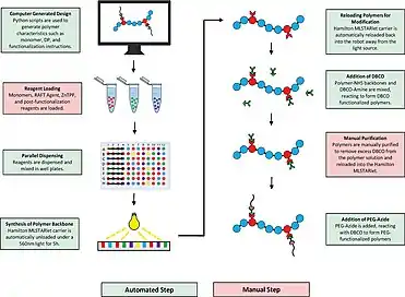 Over the years, multiple synthesizers have been developed to assist with automated synthesis, including the Chemspeed Accelerator (SLT106, SLT II, ASW2000, SwingSLT, Autoplant A100, and SLT100), the Symyx system, and Freeslate ScPPR.[14] Recently, researchers have investigated the optimization of these methods for controlled/living radical polymerization (CLRP), which faces issues with oxygen intolerance.[14] This research has led to the development of oxygen-tolerant CLRP, including with the use of enzyme degassing of RAFT (Enz-RAFT), atom-transfer radical (ATRP) that possesses tolerance to air, and photoinduced electron/energy transfer–RAFT (PET–RAFT) polymerization.[14] Through the use of liquid-handling robots, Tamasi et al. demonstrated the use of automated synthesis with executing multi-step procedures, enabling the reactions to investigate more elaborate schemes, such as with scale and complexity.[14]